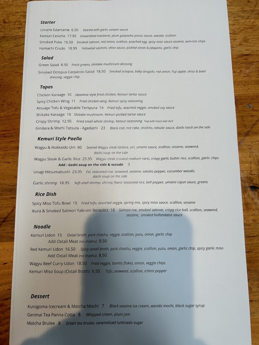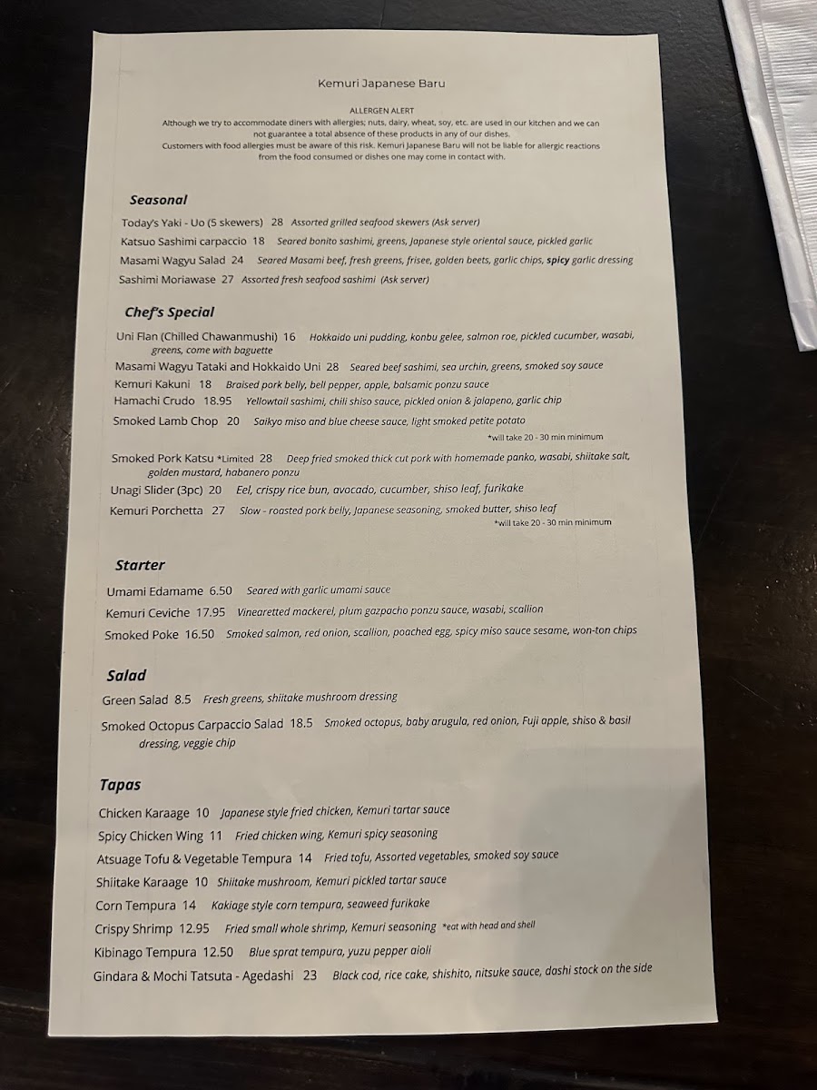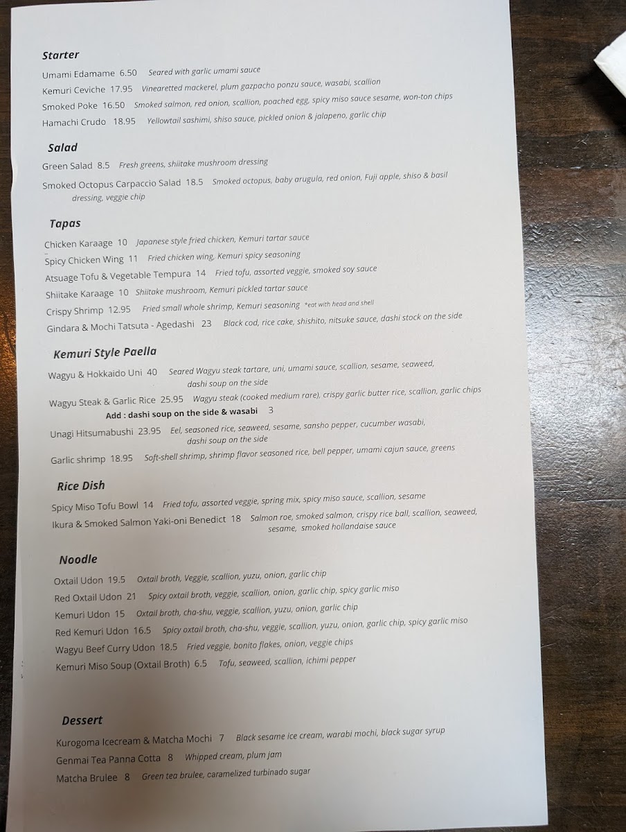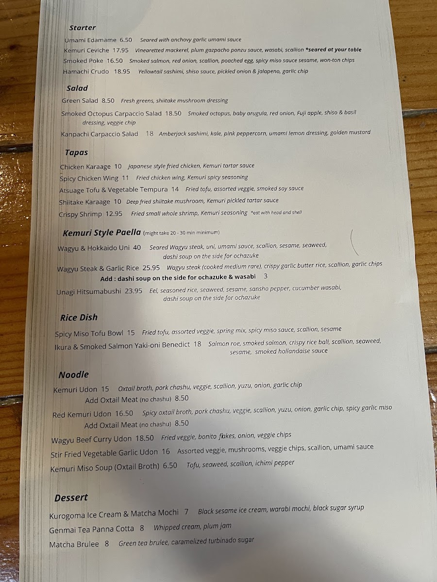 The friendly staff at Kemuri enhances the experience, offering knowledge about the menu and making personalized recommendations that ensure every visit feels tailored just for you. With a focus on fresh ingredients and artistic presentation, Kemuri promises an unforgettable dining experience where every dish tells a story.